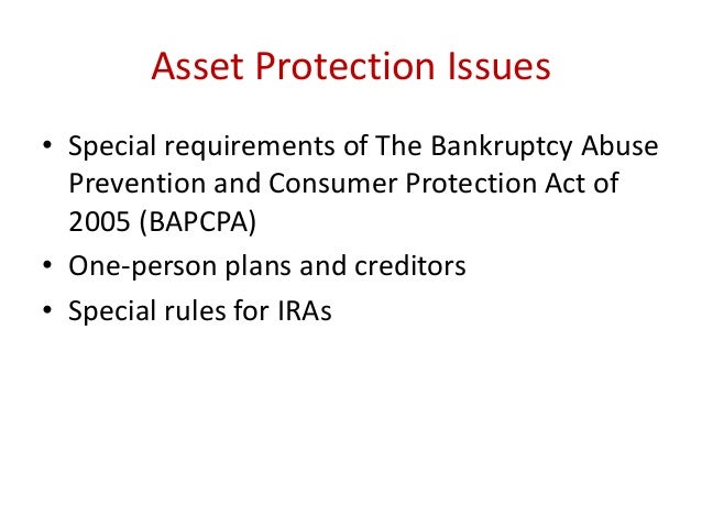 The passage of the Bankruptcy Abuse Prevention and Consumer Protection Act of 2005 (BAPCPA), which has been called Retirement Plan Assets in Bankruptcy: retirement: ... Fetch Doc